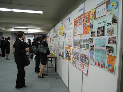 | 内容 | 京都府にある 私立幼稚園が幼稚園教諭を目指す学生さんに、 各幼稚園の園長先生や就職担当の先生が、園の教育方針や、保育の様子や内容等のお話しをしたり、 就職試験の時期や採用条件について お話ししたり、質問を受け付けたりします。 又、模造紙大の紙に各園の様子を写真や文字で、展示をします。 |